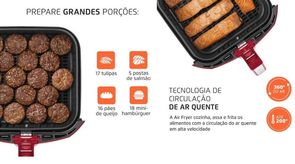 - Capacidade de 5 litros: Dá tranquilamente pra uma família de 3 a 4 pessoas. Dá pra fazer batata frita, coxinha, frango inteiro, legumes, bolo… quase tudo que você imaginar.